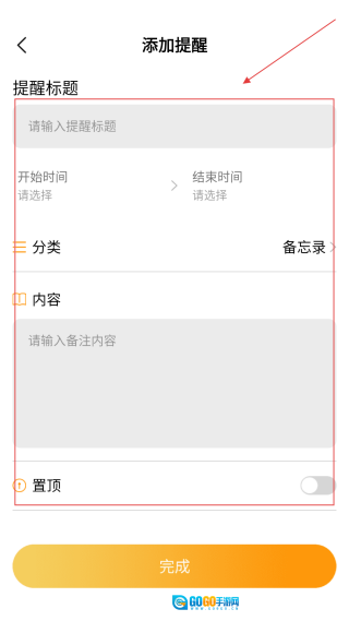 3、进入添加提醒的界面后,请填写【提醒标题、时间、分类、内容】等相关信息。