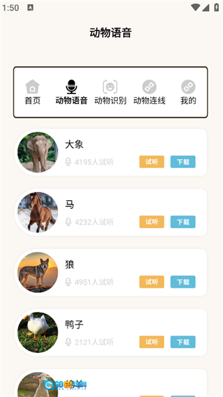 2. 提供种类丰富的动物语音内容,包含各类动物的叫声,助力用户熟悉不同动物的发音特点,从而更全面地了解动物;
