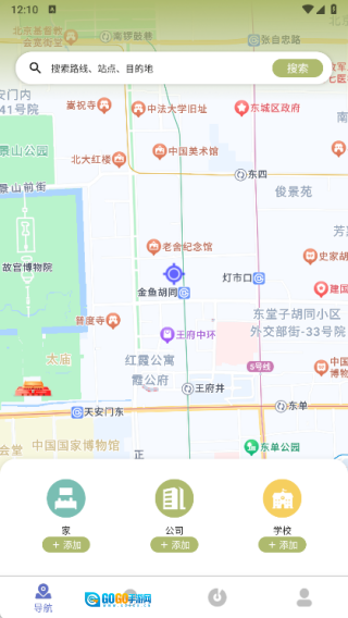 1、导航页面支持路线、站点及目的地等信息的搜索,同时也能添加家、公司、学校这类常用地点。