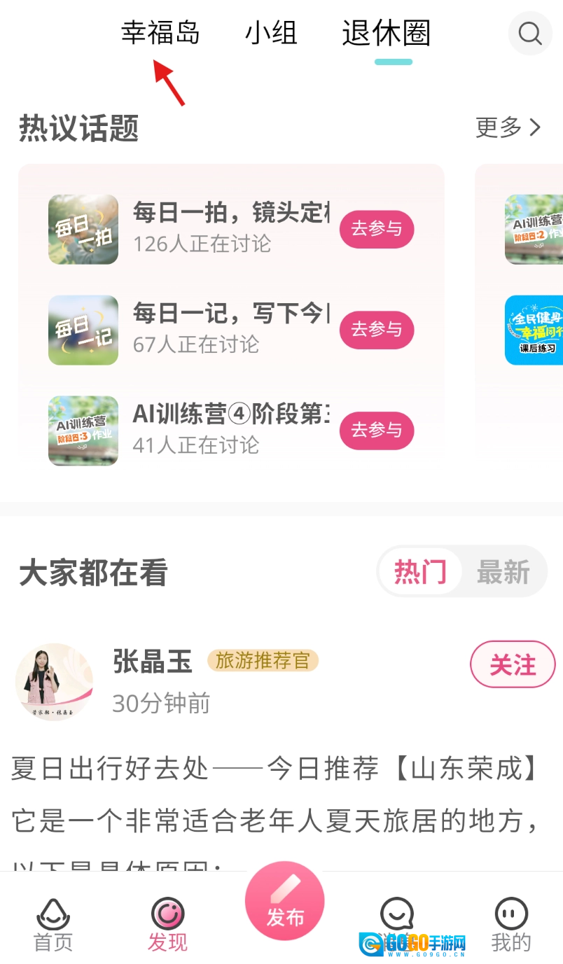2、在“发现”页面里,找到“幸福岛”模块并点击进入对应的界面。