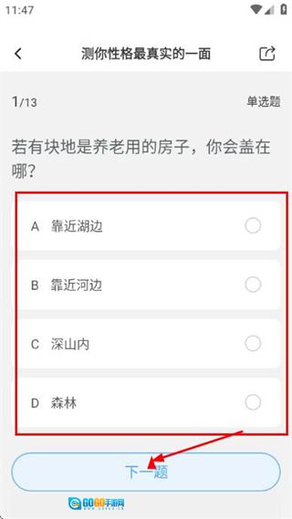 3、在测评题目页面选定相应选项后,点击下一题以继续完成心理测评。