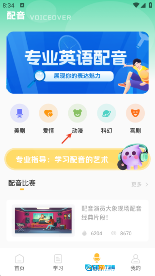 2、配音页面设有美剧、爱情、动漫、科幻、喜剧等分类选项,你可以在此处选择动漫类别。