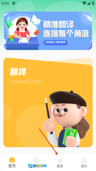 1、打开软件后,首页就配备了翻译功能,您可以在此处点击页面最下方的配音选项进入相关界面。