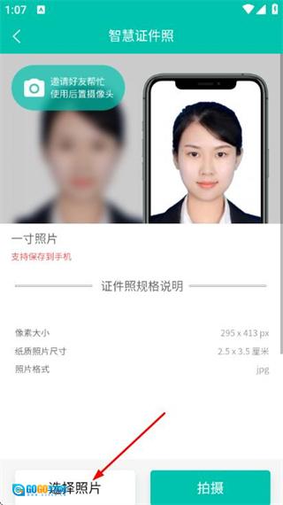2、进入证件照制作页面后,能点击“选择照片”按钮从相册中选取所需图片。