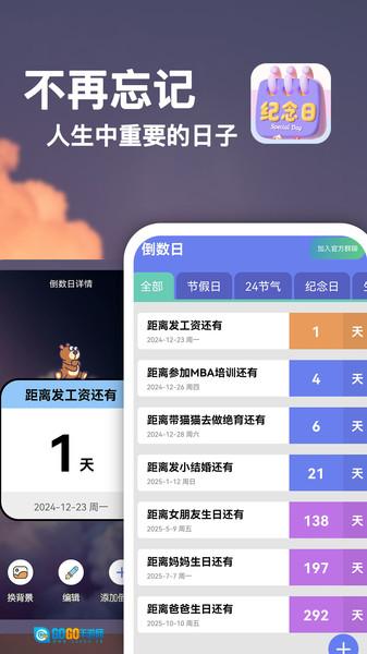 3、精准倒数计时:支持以天为单位进行倒计时,还可细化到小时、分钟乃至秒数,使用户能清晰掌握距离纪念日的每一秒变化。