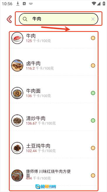 2.输入想要查询的食物后,会显示出多个类别,点击选择你想了解的类别即可。