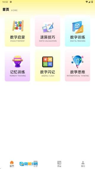 首页设有数学启蒙、速算技巧、数字训练、记忆训练、数字闪记、数学思维等多个板块,用户可免费进入学习。
