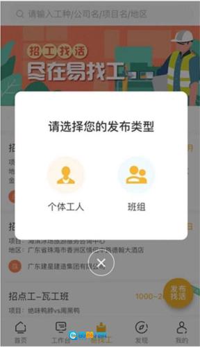 2、点击“发布找活”后,可选择以工人身份或班组身份发布找活信息