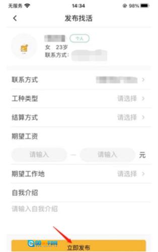 3、在找活信息填写完毕后,点击“立即发布”按钮,企业就能看到你所发布的找活信息了。