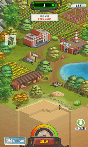 玩家将在村子里建设挖掘设备并招募更多员工来帮助你快速的挖到更深处。而且时不时会有各种不同的经营任务需要你接受完成,当你在靠挖掘发家致富的时刻,你还能叫上一众的亲戚朋友一起一夜暴富。另外,王铲铲的致富之路采用了怀旧卡通的画风,你能在游戏当中看到非常多朴实无华的建筑物和勤勤恳恳的劳动人民,丰富有趣的挖掘玩法和考验脑力的经营策略使得游戏的可玩度极高!