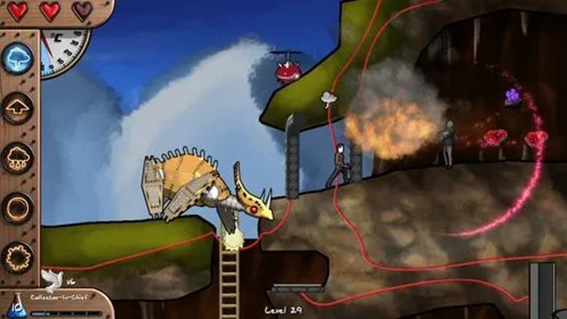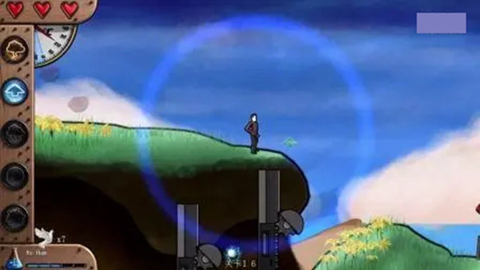主角共有五种能力,分别是雷电(主要攻击方式)、心灵移动(可以移动箱子)、下雨(可以灭火、可以蓄水攻击敌人)、阳光(可以蒸发水分、融冰)和下雪(可以使水结冰)。这五种能力不是一次获得的,而是随着游戏进程相应解锁。此外游戏左下角有个小蓝瓶,点击后可以解锁一些能力(当然,也需要满足相关条件)。