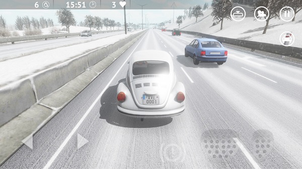左上角第一个则是行驶的距离,中间则是时间计时,依次是生命值。若车辆发生碰撞则会损失一格生命值,右上方的图标信息依次是后视角,相机(视角切换),暂停和菜单按钮以及车辆内部的灯光、喇叭和转向灯。