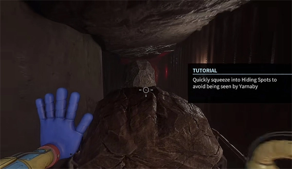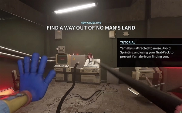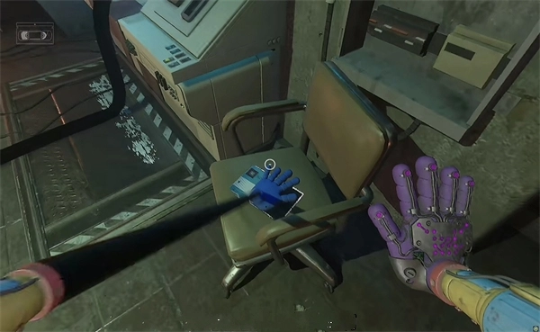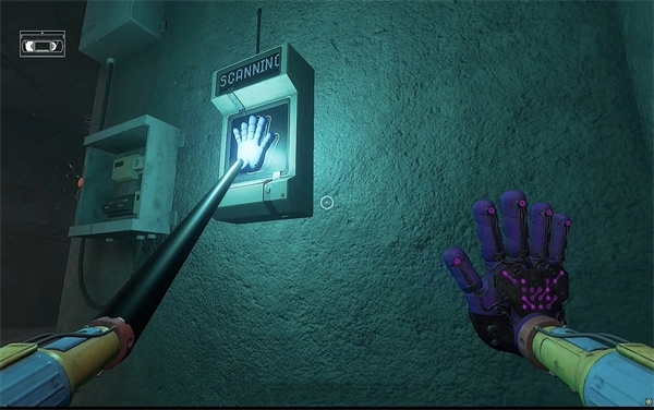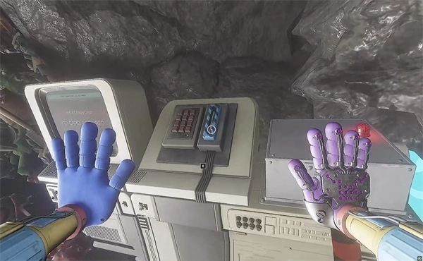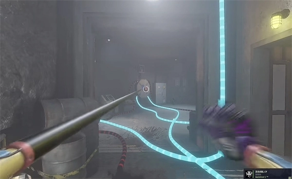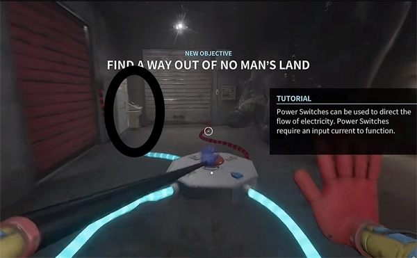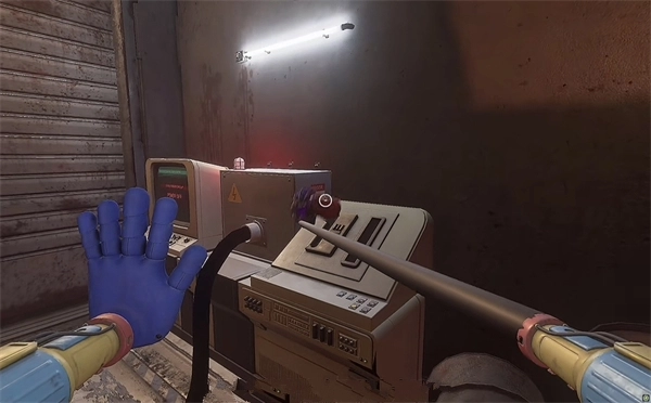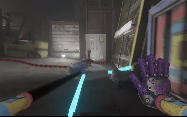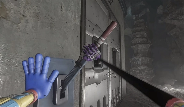 6、打开门后,往里走还会看到一个开关,把它拉下来。接着继续向前走,用蓝色手臂与前方的开关进行互动。注意,这里需要触发三个开关,才能让电流接通,打开出口。