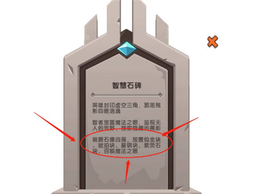 二、于下图所示位置,在四周遗迹柱子前一格,即距离神秘图腾3格之处放置。石块放置顺序并无影响,只需为这4种石块即可。