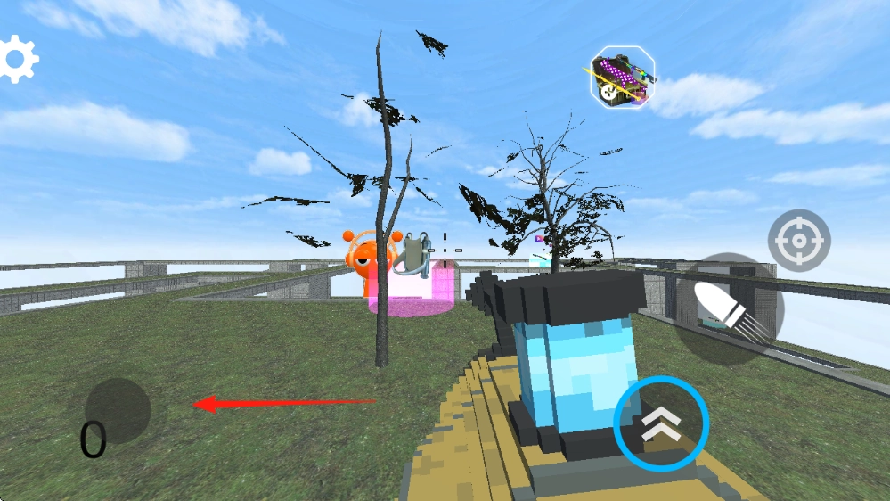 1、用左侧摇杆控制角色像素风格人物、坦克,在草地场景移动,靠近敌人橙色、红色怪物。