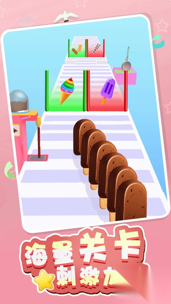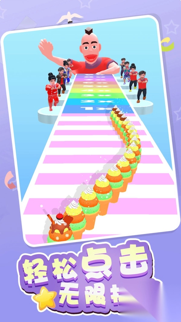 1. 操控着冰淇淋堆在跑道上向前行进,通过点击屏幕来调整方向,途中收集彩色甜筒、巧克力等食材,让冰淇淋堆不断堆叠从而变得壮大。
