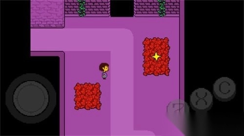4)去到北面的藤蔓房间内会遇到青蛙froggit,选择“行动——赞美”,虽然青蛙不知道你在说什么,但他变得很开心,他就会逃离战斗。在右面的水池上有一个尖刺陷阱,Toriel会牵着你的手通过这个陷阱区域。