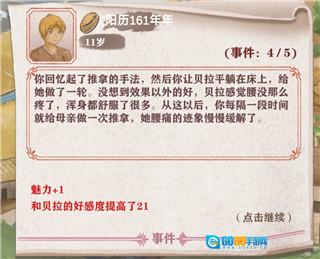 6、妈妈感到腰酸背痛,你心疼她,想为她做推拿缓解。不过这需要具备22点灵敏,推拿成功后,你的魅力值会增加1点,同时妈妈对你的好感度也会提升16点。