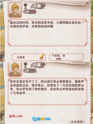 10、夜晚睡觉时若听到异响,去探寻其来源,有可能获得100金币,也有可能一无所获。