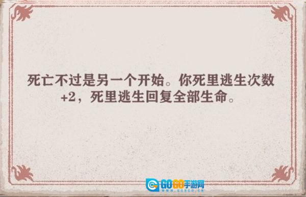 通常不建议使用该天赋。确实,死里逃生是高难度关卡中难以避免会用到的工具,但依靠大量逃生堆积来通关,恰恰证明自身数据(涵盖面板、天赋、技能、遗物等方面)存在欠缺。也就是说,只有那些不懂得合理搭配面板、天赋、技能与遗物,且无法通关(通俗讲就是水平欠佳)的玩家,才会推荐使用这个天赋。一般而言,这个天赋并不强大,因为携带此天赋意味着在常规回合中仅有两个天赋可用,这会对发育节奏造成严重影响。而且,面板、技能、遗物方面的差距所产生的影响,已然超过了死亡回归带来的收益。