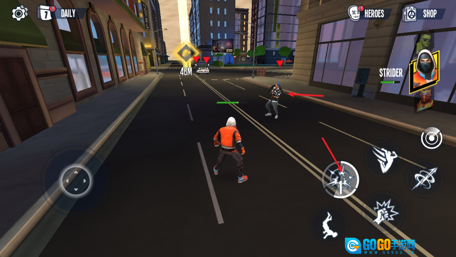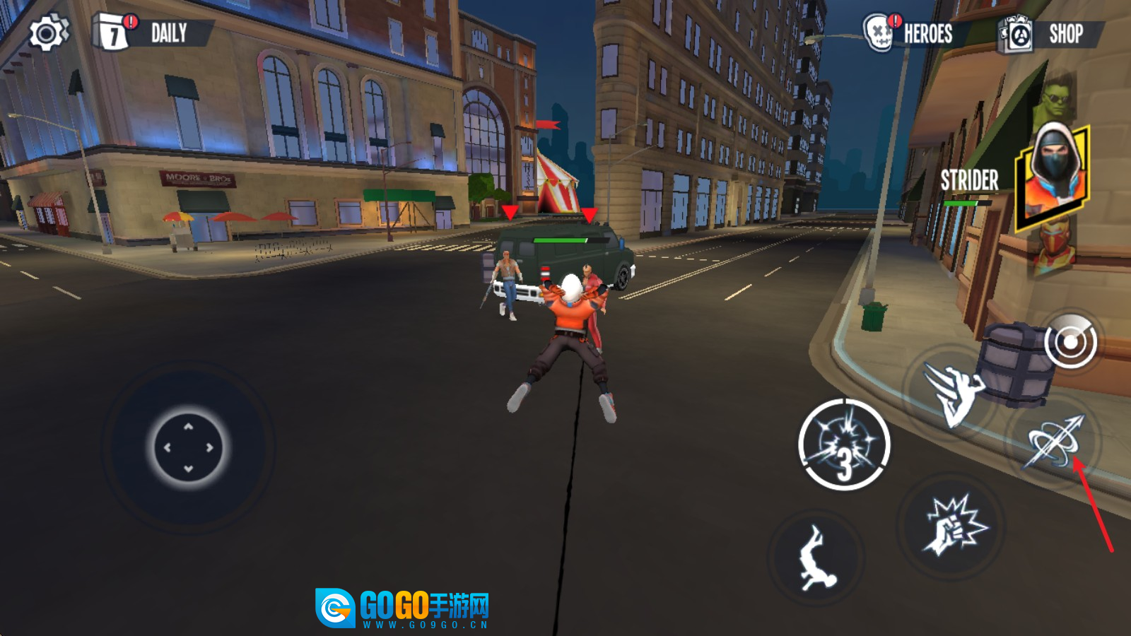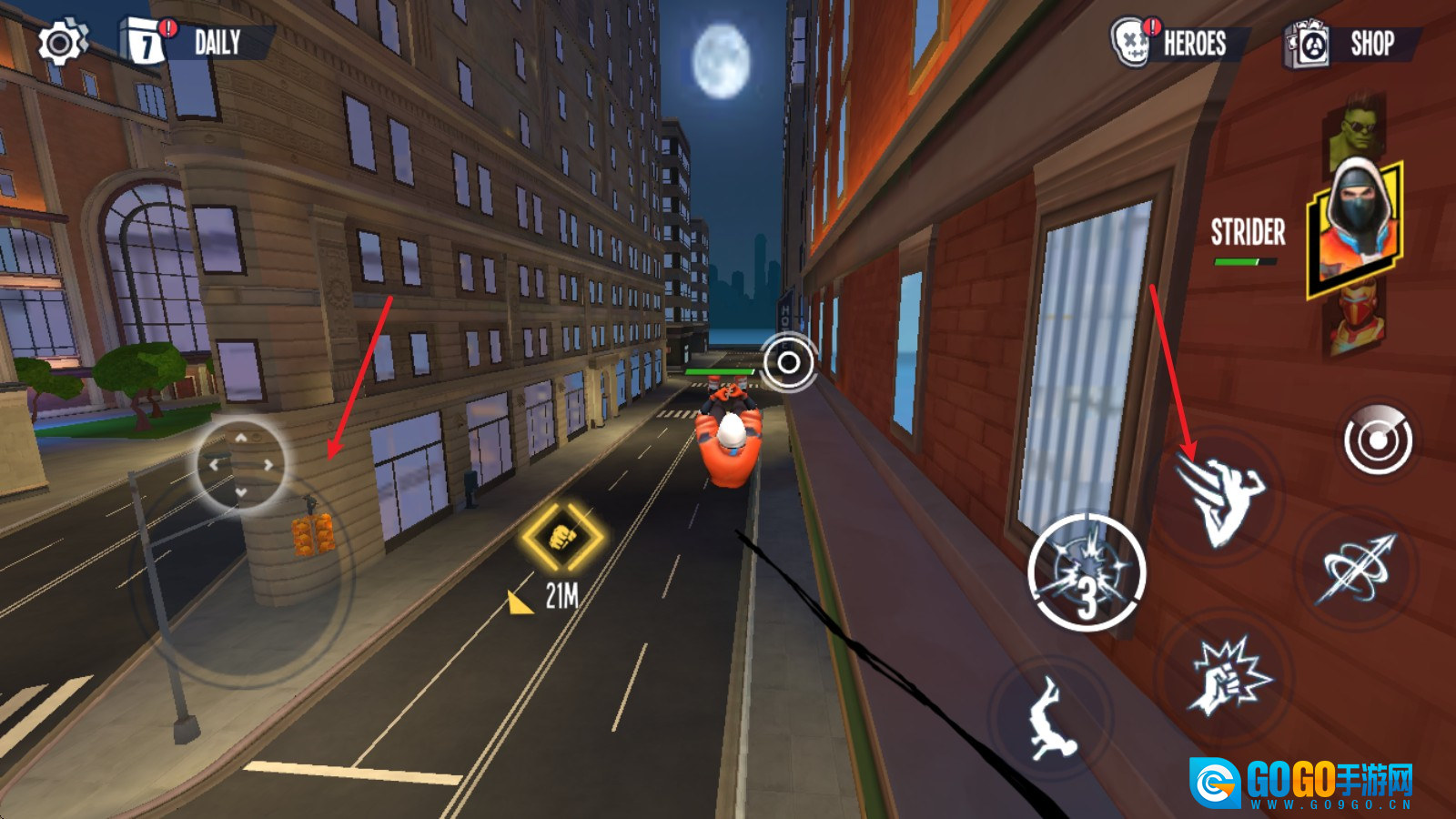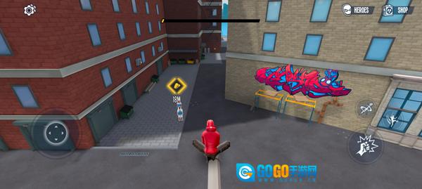 1. 进入游戏之后,我们借助左侧的摇杆来操控移动,只要按住右侧的飞跃键,就能凭借蛛丝飞起来。