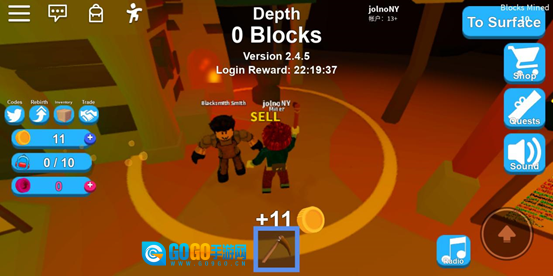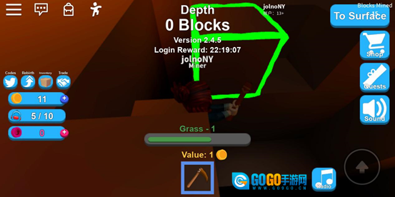 第一步,我们需前往矿场。接着,点击屏幕正下方的木镐进行装备。随后,点击想要挖掘的矿,此时矿会出现绿色框框,长按即可开始挖掘。选定目标后,我们便能知晓当前矿的价值。起初,我们仅能挖掘价值1金币的矿,一次最多装满10个矿,总计价值10金币。