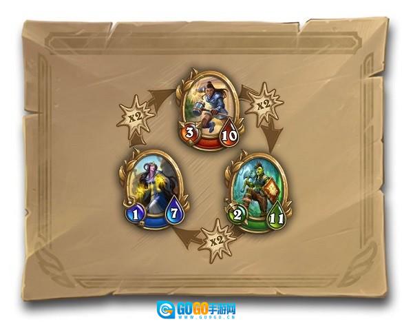 在该模式下,不同职业间存在双倍伤害的克制关系。具体而言,红色护卫克制绿色斗士,绿色斗士克制蓝色施法者,蓝色施法者又克制红色护卫。并且,这种克制关系贯穿于所有技能。也就是说,无论绿色施法者使用物理技能还是法术技能,对红色护卫都能造成双倍伤害。