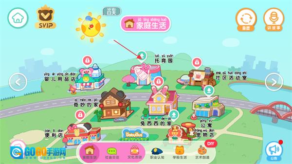1、借助左右两侧的箭头,能够挑选不同的建筑展开游玩。点击托育园上方的按钮,即可进入相应场景。