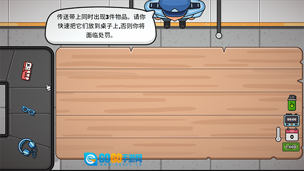 2、接下来,我们要把传送带上的物品放到桌子上。