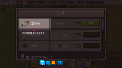 5、于空白区域搭建一个工作台,查看所有可建造的建筑。