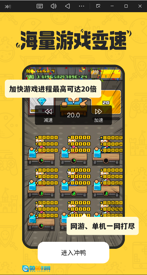 5、当你进入游戏后,屏幕上会出现一个变速悬浮窗(一般呈现为一个数字或者按钮),只需点击这个悬浮窗,就能对游戏速度进行调节(可选择1倍、2倍、5倍,最高能达到20倍) 。