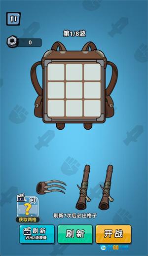2. 玩家进入关卡后,需把初始武器放置到背包的格子中,同种武器能够合并以提升等级,点击“刷新”即可获取新武器。