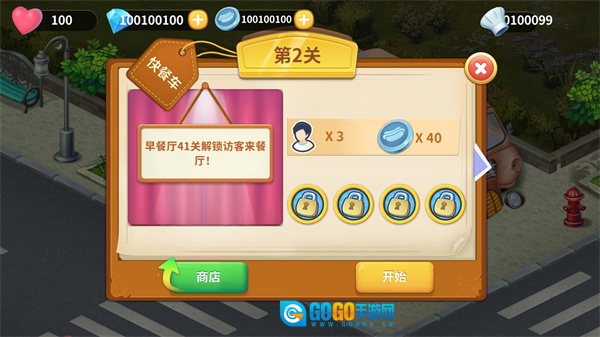 3、在右上角会展示关卡目标,例如接待特定数量的顾客、达成一定的营业额、收集点赞等等。当玩家顺利通过关卡后,即可获得奖励,而这些奖励中的厨师帽,能够推动主线剧情的发展。