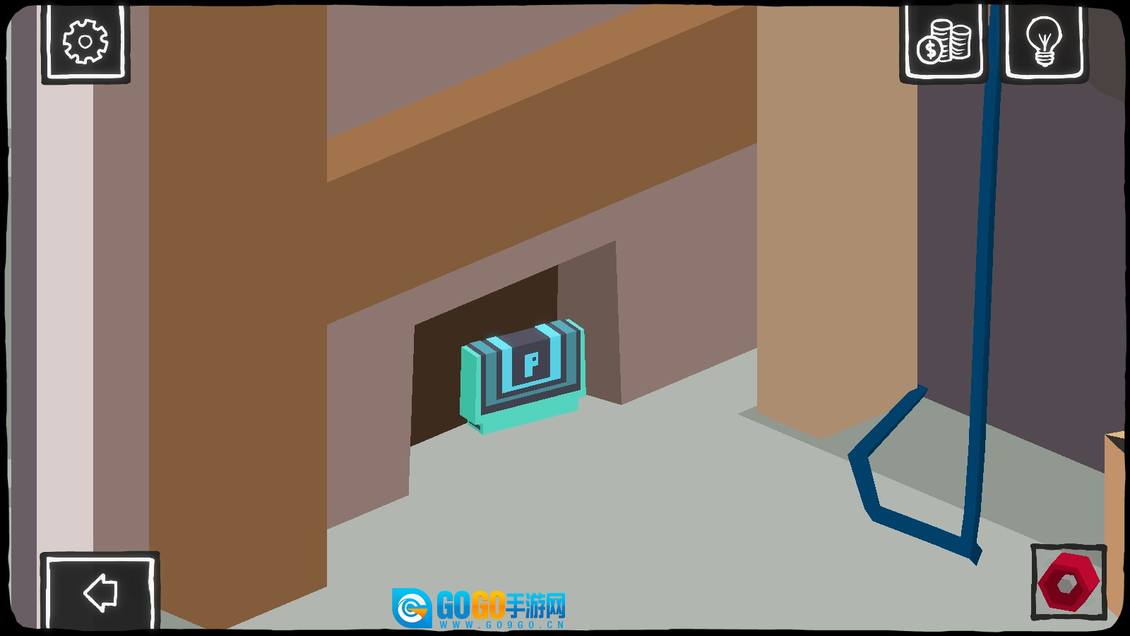 5、转动视角,找到卷帘门,把红色按钮装在卷帘门的控制器上,卷帘门就能打开,随后就可以离开第一场景,去往庭院。
