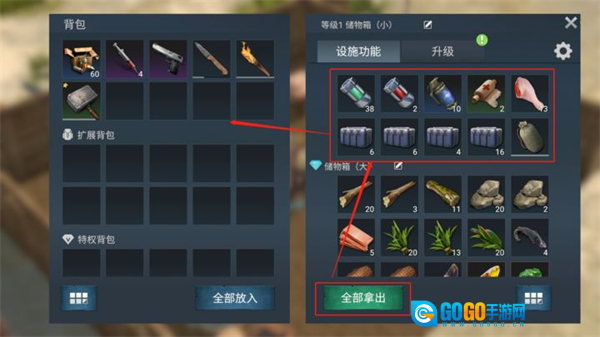 我们能够进入原本的箱子,点击“全部拿出”选项,就能迅速把箱子里的物品取到背包中。
