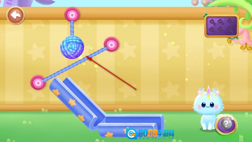 宝贝,咱们来分析分析哈:小猫就在毛线球的正下方呢。所以呀,咱们只要先把旁边两根绳子剪断,把控好方向,最后再把中间那根绳子剪断,这样毛线球就能准确无误地落到小猫身边咯!快快来试试看呀!