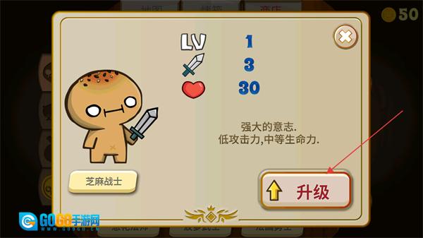 4、查看芝麻战士的相关属性数值,点击下方的升级按钮,消耗金币即可提升攻击力等基础属性。