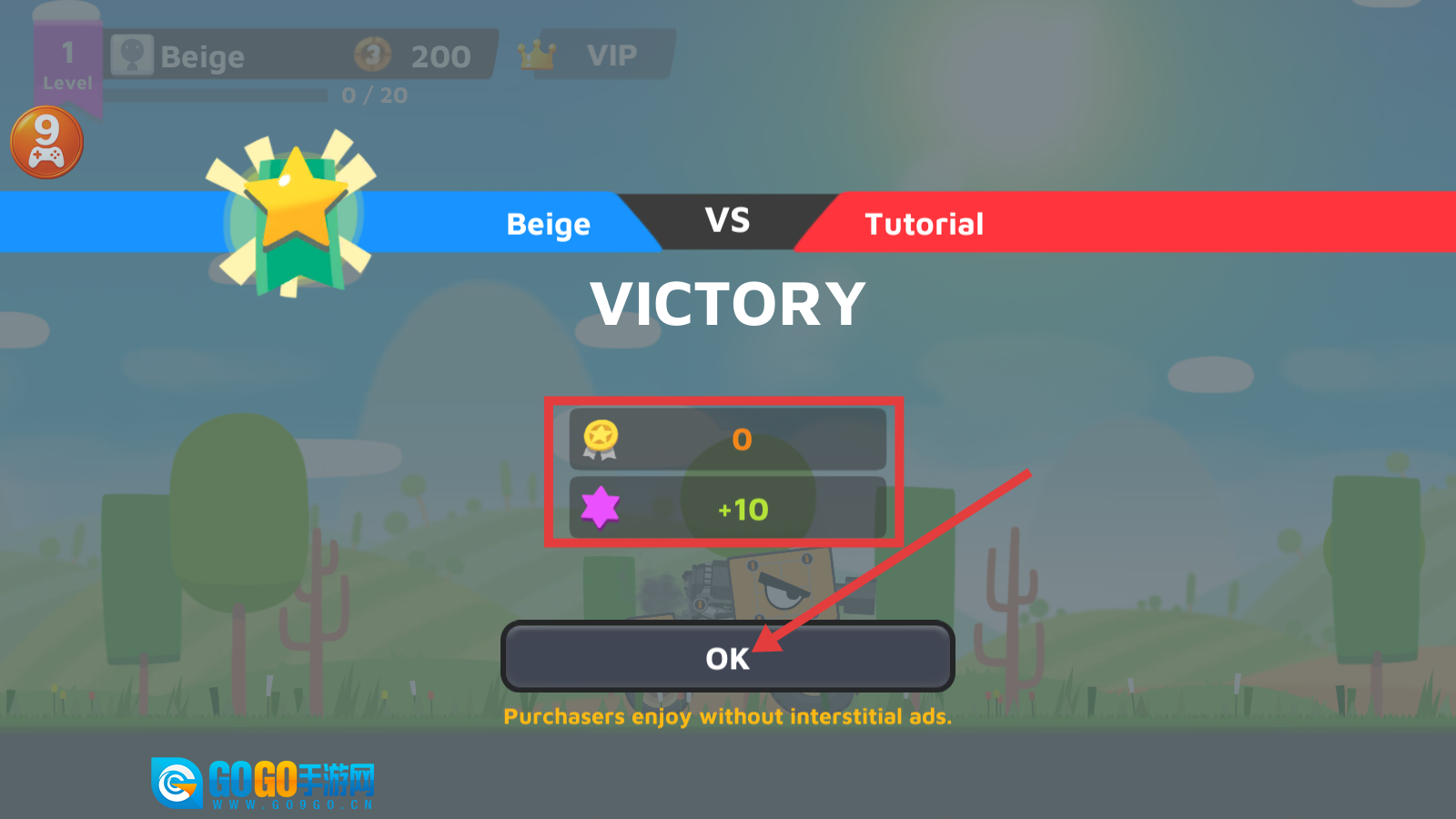 4、取得胜利后,点击【OK】按钮,即可领取 +10 星星的奖励。随后可继续迎接挑战,提升自身等级,进而解锁更多的坦克以及玩法。