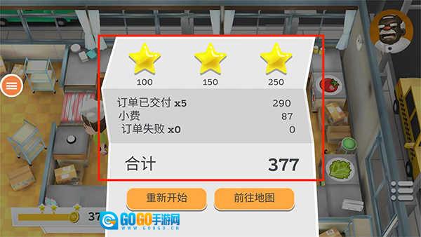 一轮结束后,界面会呈现此次获得的星星数量、订单完成率和额外小费收入。表现得越优异,奖励就越丰厚,同时也为后续关卡的解锁助力。