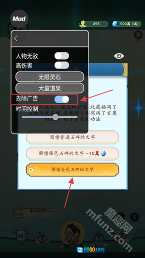 3、启动去广告模式,全身心投入解读石碑,一心学习新功法。