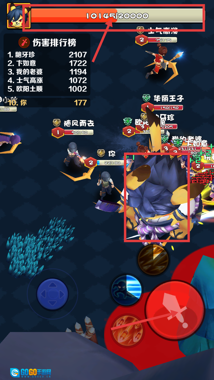 3、投身打BOSS模式,留意BOSS血条【10145/20000】,审视伤害排行榜以调整策略,与队友协作攻击BOSS,提高输出。