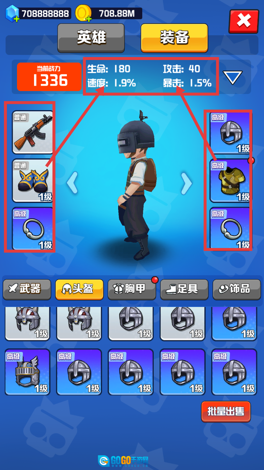 2、于装备界面,挑选【普通 - 高级】装备进行搭配,以此提升【生命 - 攻击 - 速度 - 暴击】等属性,当前战力强化1336,为战斗提供助力。