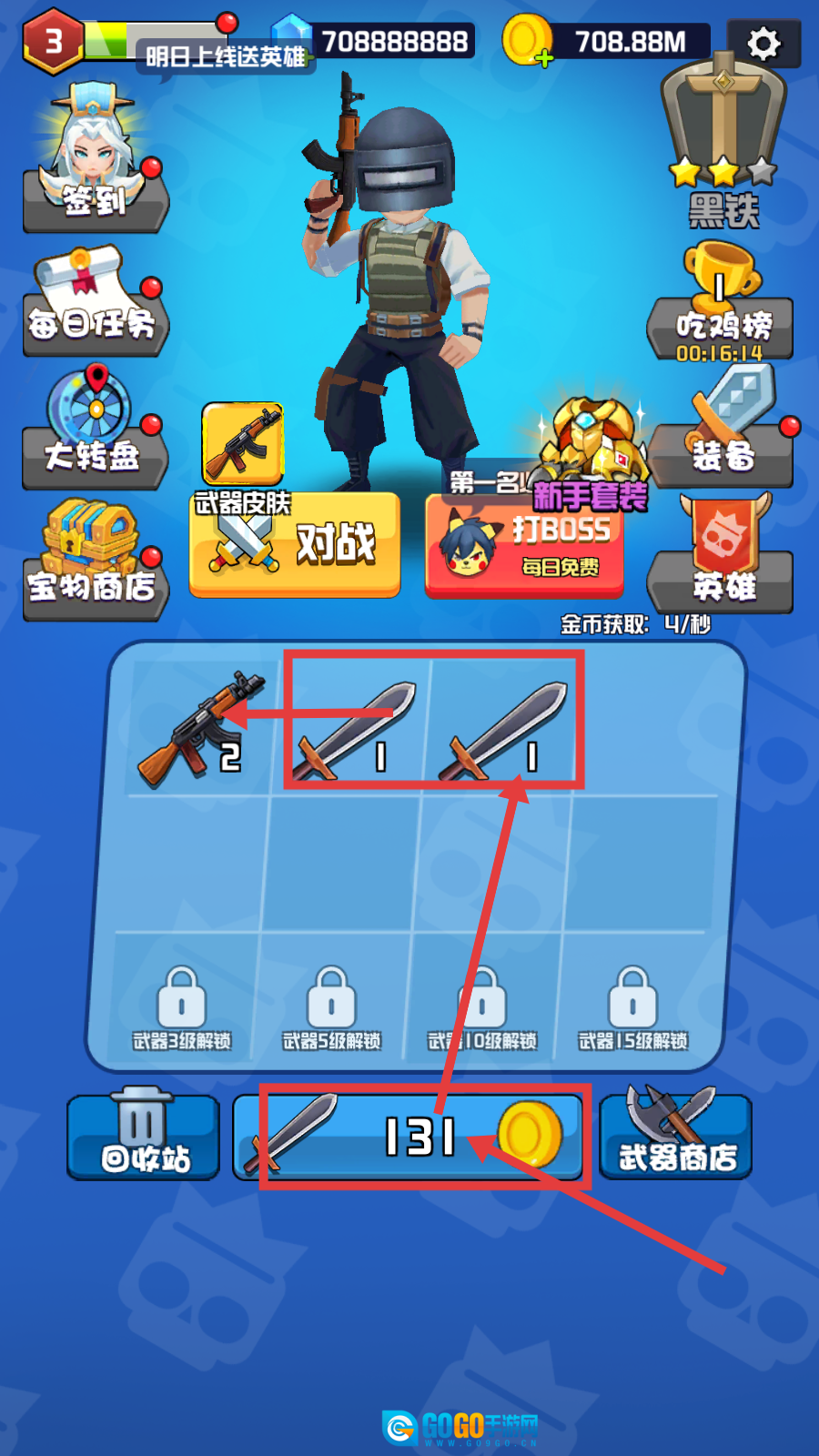 1. 借助武器合成系统,对【1级剑 - 1】等武器进行合成升级,经由【对战 - 打BOSS】来获取金币资源,从而提升武器的战斗力。