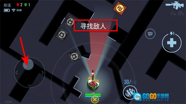 2. 操控左侧虚拟摇杆来移动角色,凭借视野探寻敌人,锁定目标后实施射击。