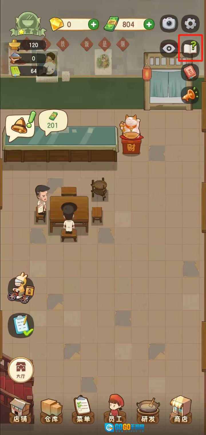 9、此刻我们能够做好准备迎接客人光临。待客人抵达,点击客人头顶显示的需求,为其提供上菜服务。上完菜之后,点击客人头上的钞票图标,便能查看此次消费的金额以及获得的利润。