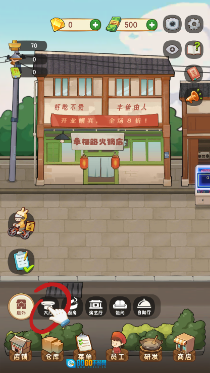 4、随后点击左下角的【店外】,记得要打扫一下大厅。