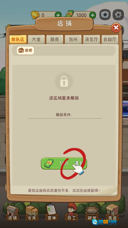 5、若要清扫店铺,需点击左下角的【店铺】,在弹出页面支付300元清扫费。接着是餐饮的核心区域——厨房,同样点击左下角的【店铺】,并在弹出页面支付200元清扫费。