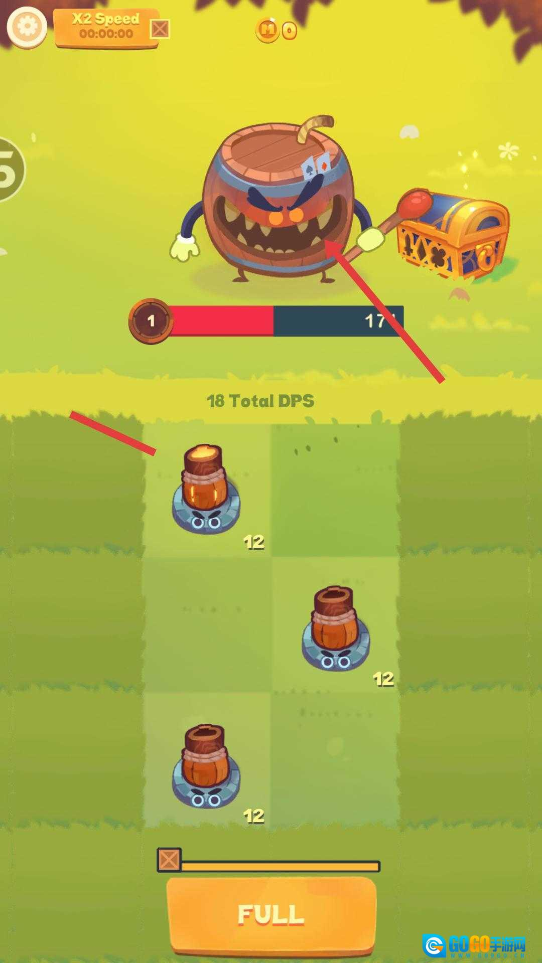 2、成功解锁攻击单位后,需合理安排它们的位置,使各单位协同作战,持续对木桶敌人展开攻击,从而降低敌人的血量。