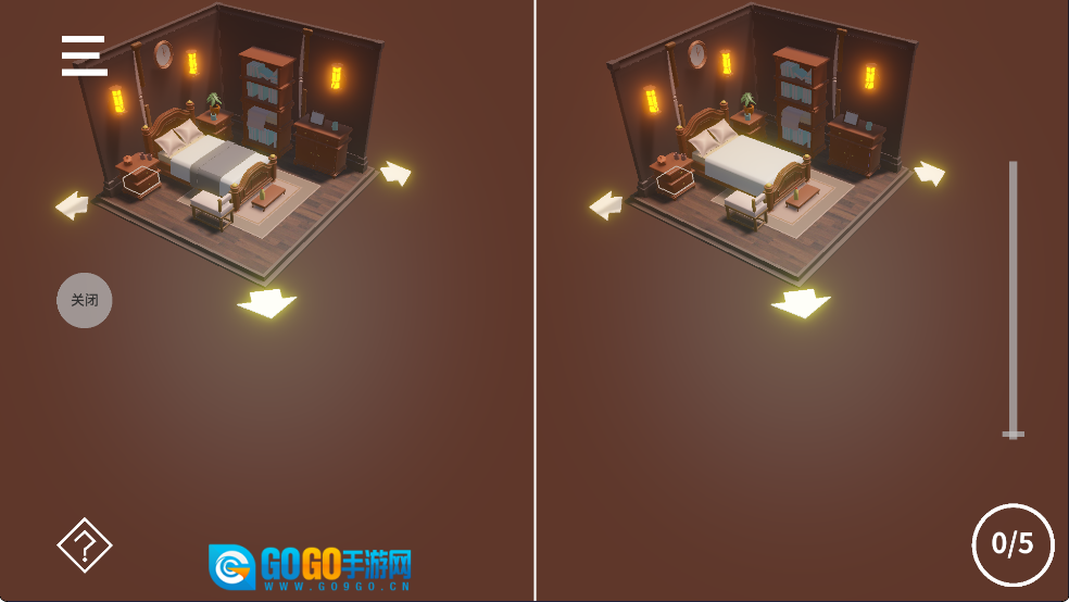 在“对比区别”画面中,两侧呈现房间场景。你可以借助“放大缩小移动观察视角”的操作,以及点击房间周边的“箭头”来变换观察中心视角,从而找出不同的物体。当成功找出所有不同物体后,就能顺利通关当前关卡。