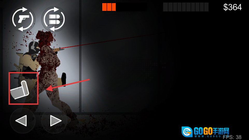 3、当僵尸靠近,点击左侧按钮进行近战,一脚踢开僵尸,同时配合射击清理场地,成功击杀僵尸后可获得【$364】金钱。